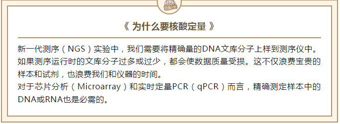 新一代測(cè)序(NGS)實(shí)驗(yàn)中,我們需要將精確量的DNA文庫(kù)分子上樣到測(cè)序儀中。如果測(cè)序運(yùn)行時(shí)的文庫(kù)分子過多或過少,都會(huì)使數(shù)據(jù)質(zhì)量受損。這不僅浪費(fèi)寶貴的樣本和試劑,也浪費(fèi)我們和儀器的時(shí)間。對(duì)于芯片分析(Microarray)和實(shí)時(shí)定量PCR(qPCR)而言,精確測(cè)定樣本中的DNA或RNA也是必需的。