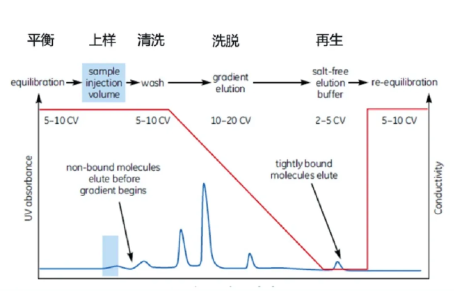 離子交換層析是基于蛋白質(zhì)和離子交換層析介質(zhì)之間的電荷相互作用進行分離。離子交換層析介質(zhì)通常帶有正或負(fù)電荷,吸附帶有相反電荷的蛋白質(zhì)。通過調(diào)整緩沖液的離子濃度或pH值,可以改變蛋白質(zhì)與介質(zhì)的結(jié)合強度,實現(xiàn)不同蛋白質(zhì)的分離。